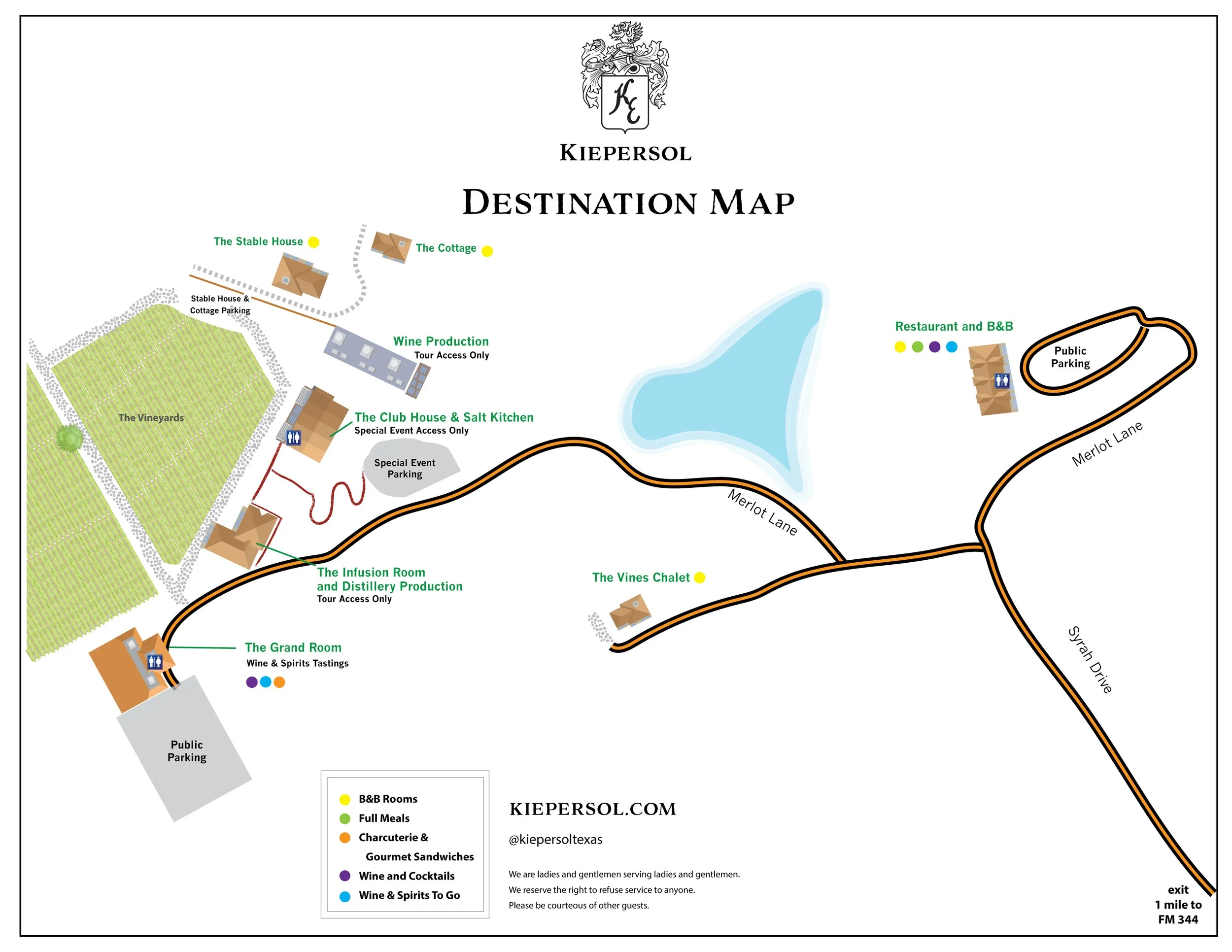 We are located south of Tyler, Texas. Make sure to use FM 344 E off US 69 to reach Kiepersol. Yes, if you are looking for the Restaurant or Grand Tasting Room for wine and spirits tastings at the vineyard, you have to travel 1 mile through the Kiepersol Estates subdivision.